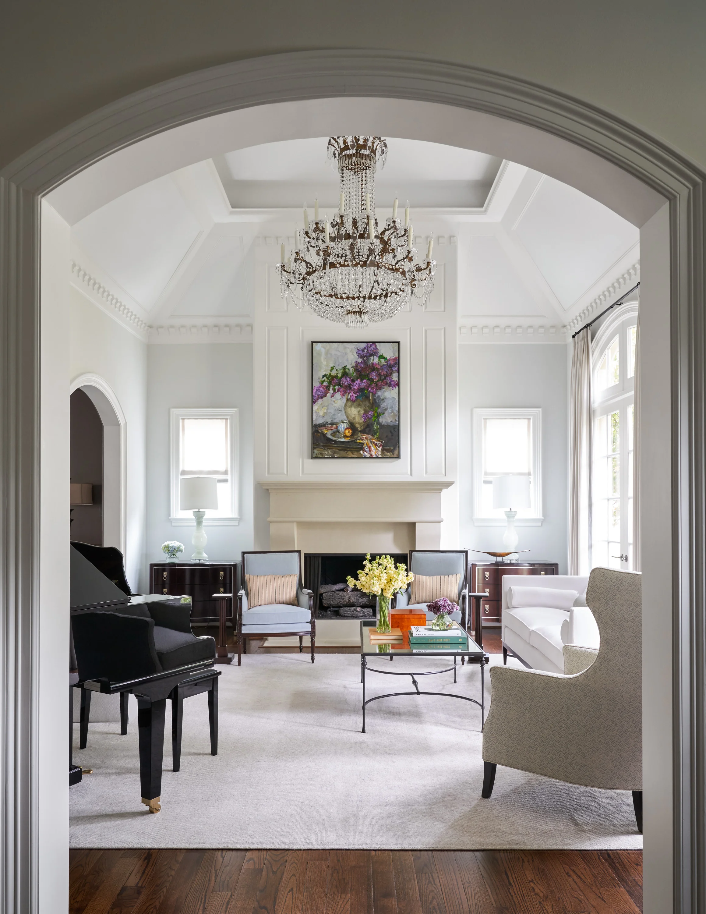 My clients, who are young professionals, wanted a calm and relaxing environment for themselves and their young children. If you can believe it, the home was originally faux finished in golds and Tuscan reds - the exact opposite of the airy and refined look my clients wanted. The tall windows and ceilings, and the gorgeous architectural details, set the tone for the interiors I designed, like in the cultured living room above and below.