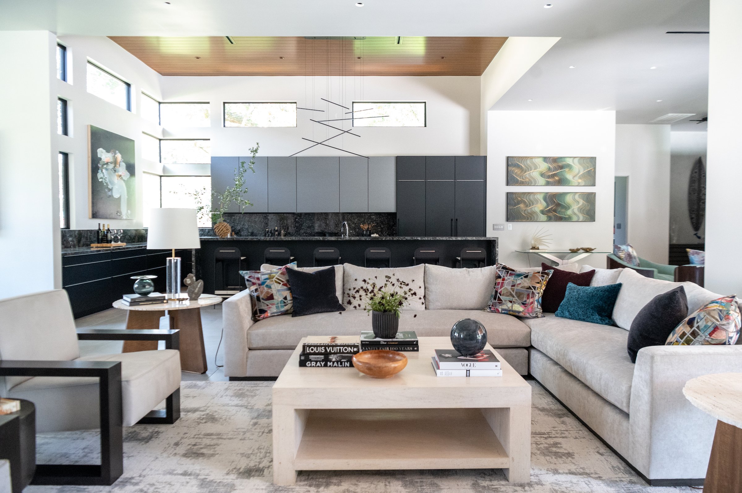I wanted the kitchen to be a real show stopper, so we crafted custom black cabinetry that complements the stunning quartz counters and backsplash. The upper cabinets are painted in Anthracite Gray. And the gorgeous natural light floods into the space from the unique windows. Original art from Janna Watson fits the color palette beautifully, while an incredible mobile-like light fixture from Kuzco floats above the bar.
