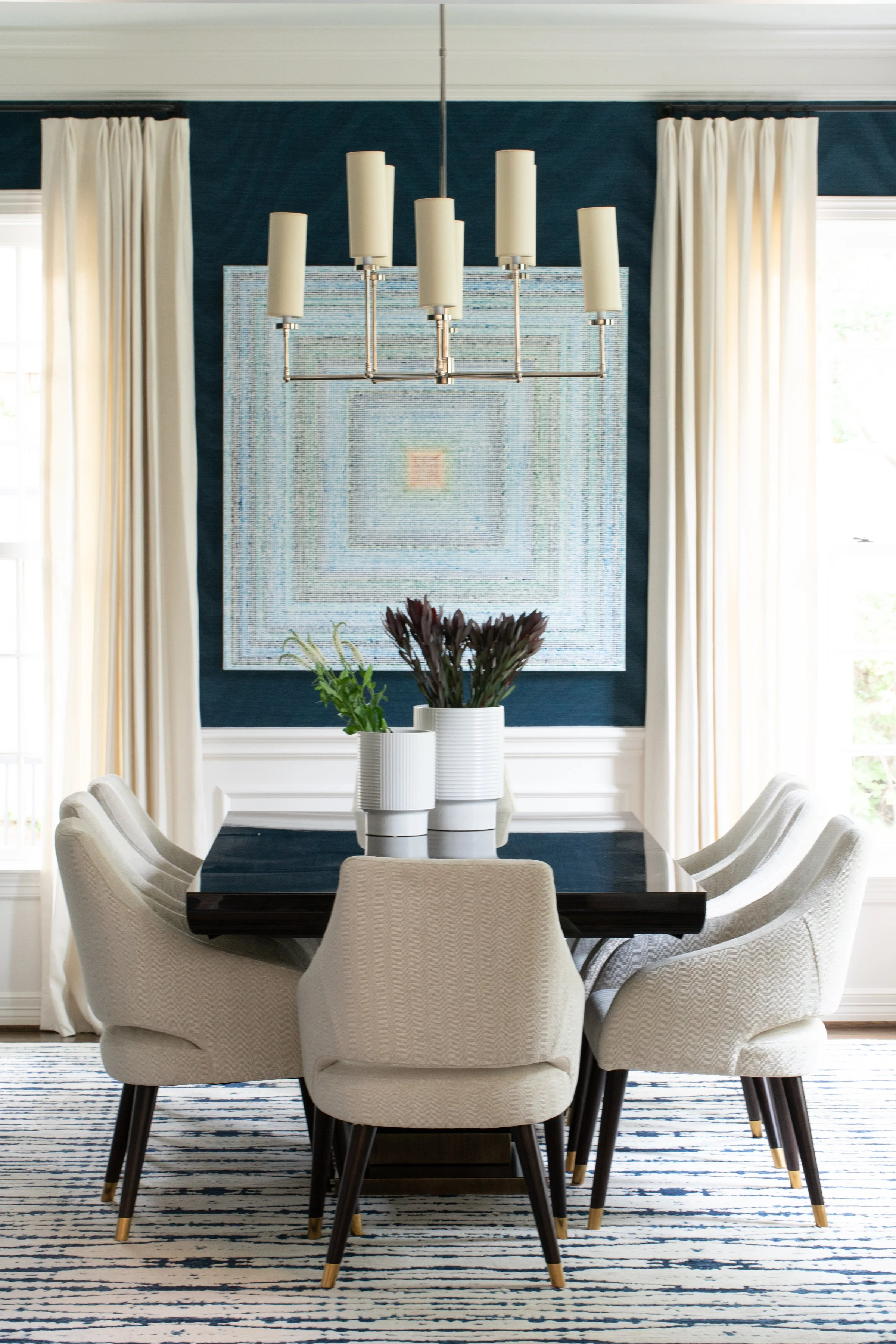 You don’t want a very high-pile carpet in this room because that makes it difficult to push your chair back from the table as you stand. And you do want every chair to have the room to pull out or in without dropping off the rug. Remember, too, that rugs can also be art for the space, as you can see above. That rug ties together the entire pretty palette.