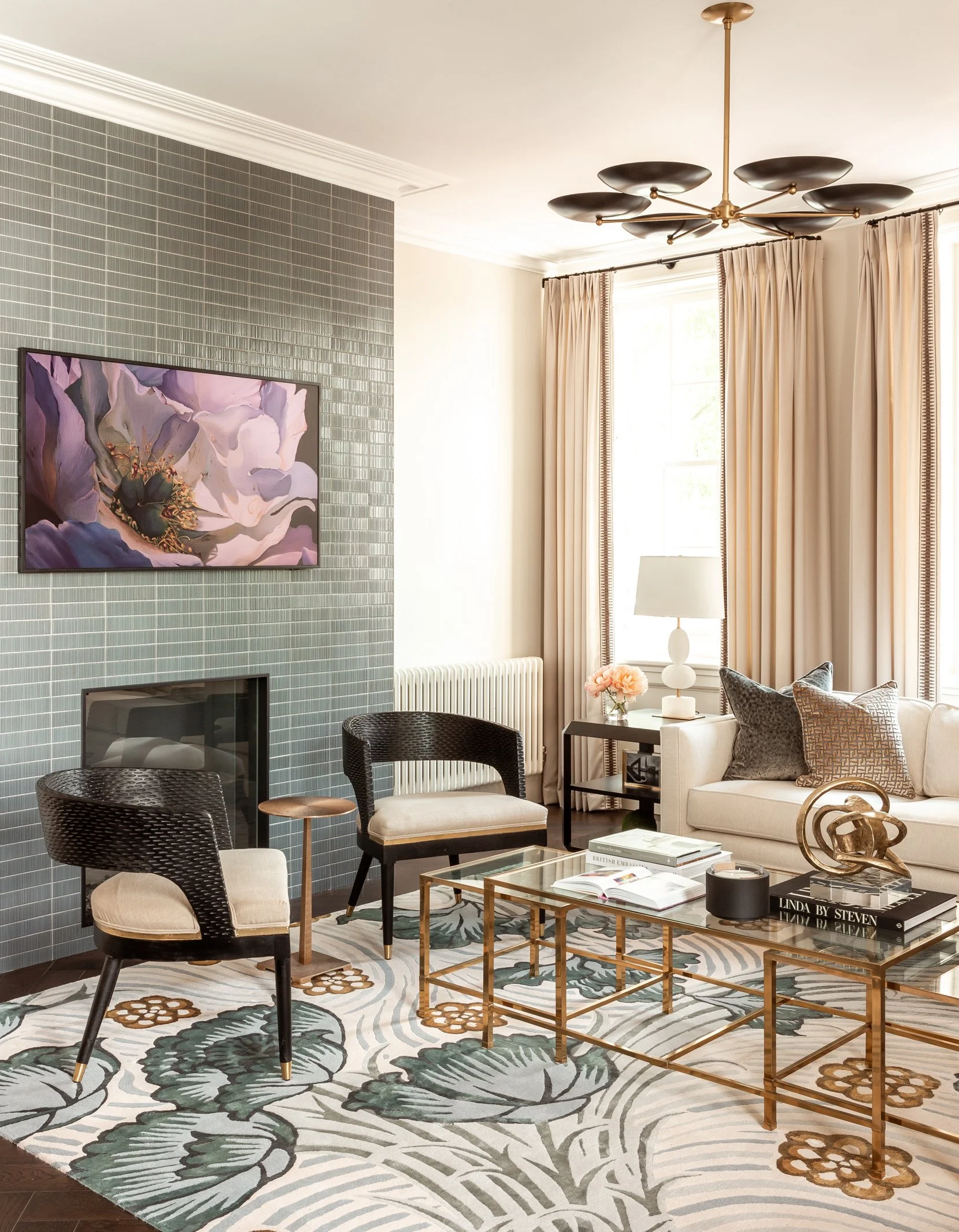 In this room, it’s best to invest in the largest rug you can get. I’ll often use carpet and have it finished all the way around so I can get the exact dimensions I need in a large space. A good rule of thumb is to be sure that all the seating and tables have room to be placed on the rug. This is why I often go custom for living rooms and bedrooms - then I can get the perfect color and size for my clients.
