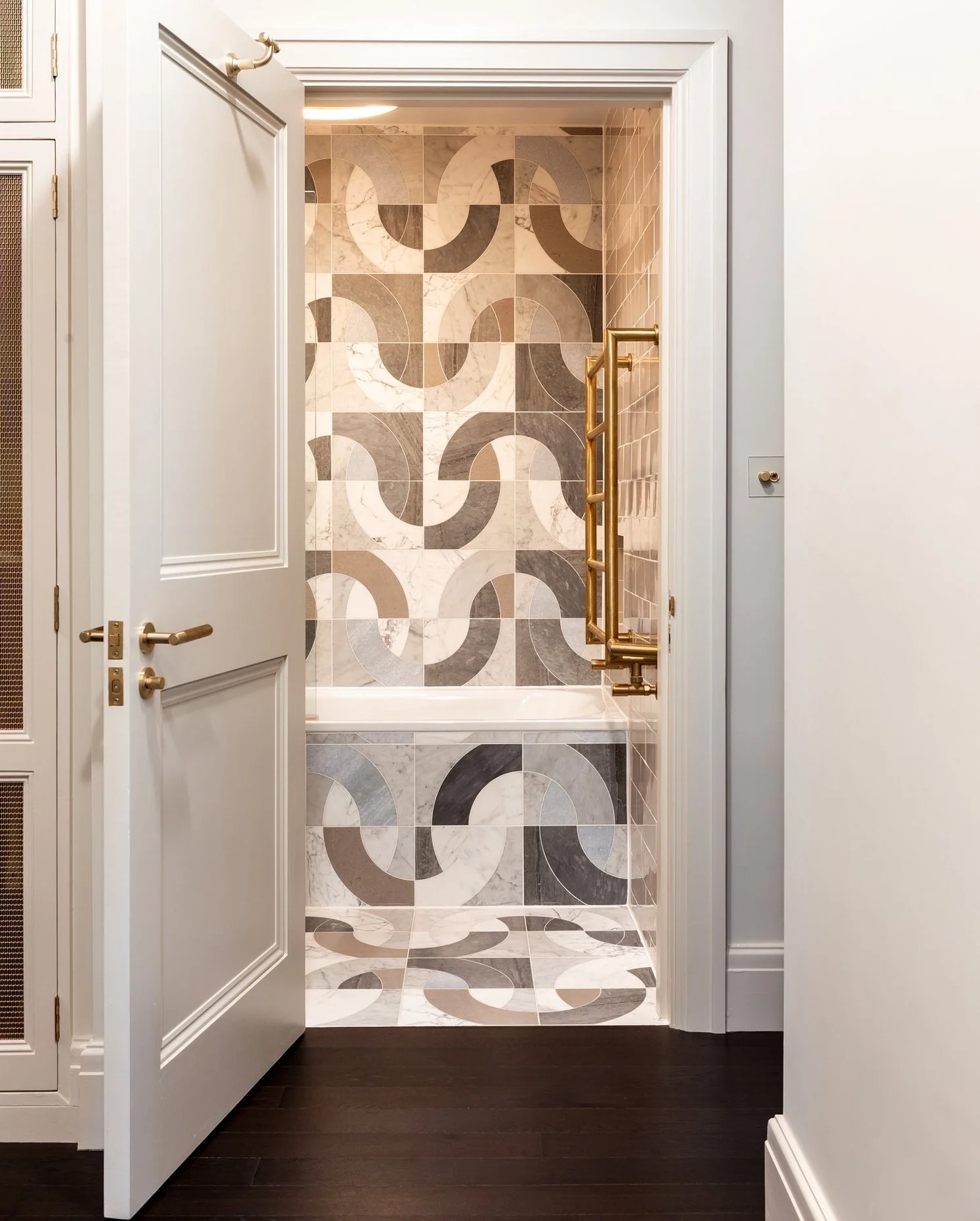 Tile gives you an almost limitless palette of ideas when it comes to patterns. There’s no need to stick with the traditional subway tile or penny tile patterns. Let your imagination run free, like I did in my Kensington bathroom above. Those Ann Sacks tiles offer waves of originality!
