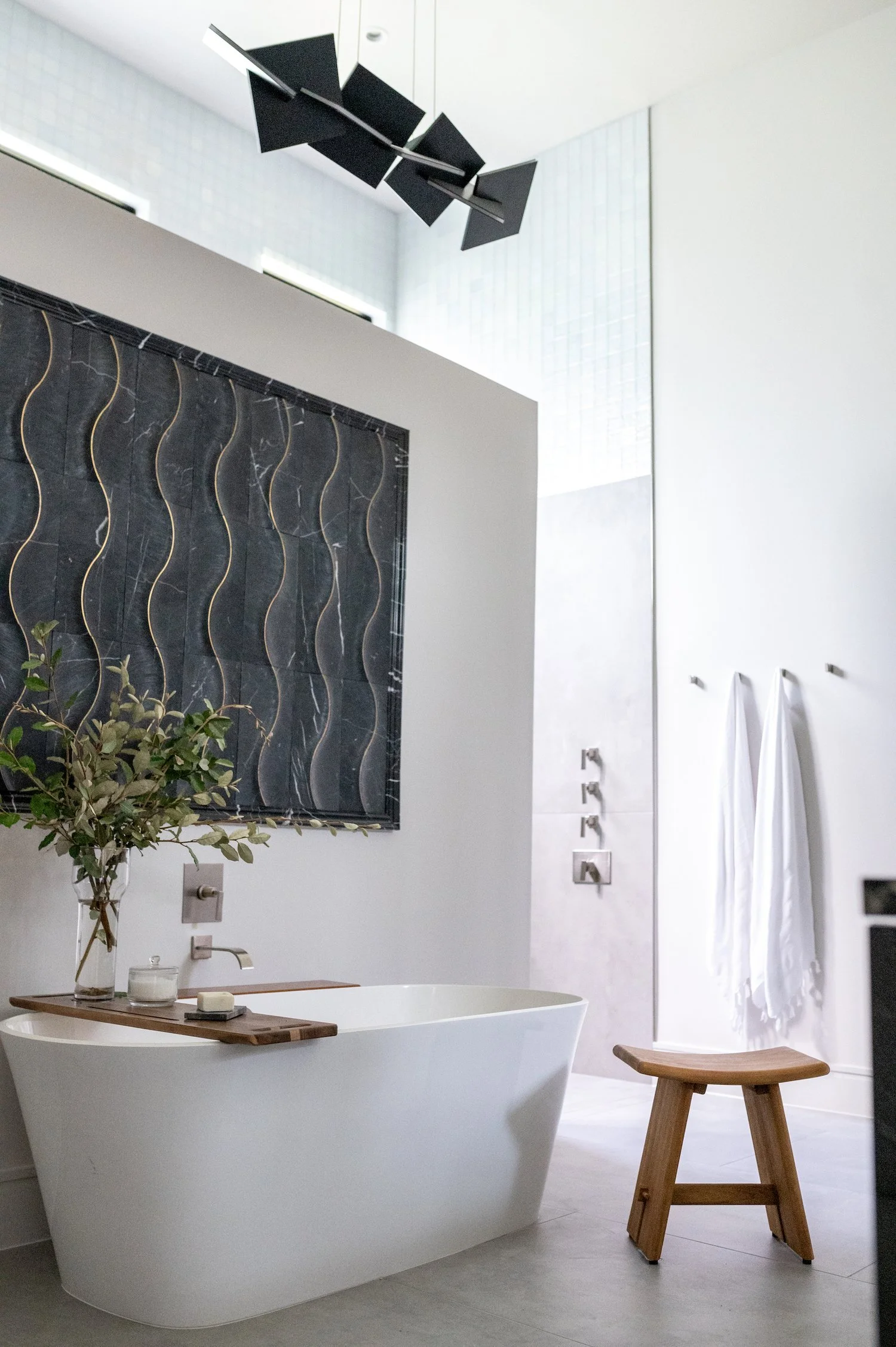 In the bathroom above, I wanted a unique piece of art over the tub that could withstand all the moisture and heat in the room. So I used a wave-patterned tile to craft an original piece of art! When you’re dreaming of unique ideas for your home, think about how tile can fit into the concept!